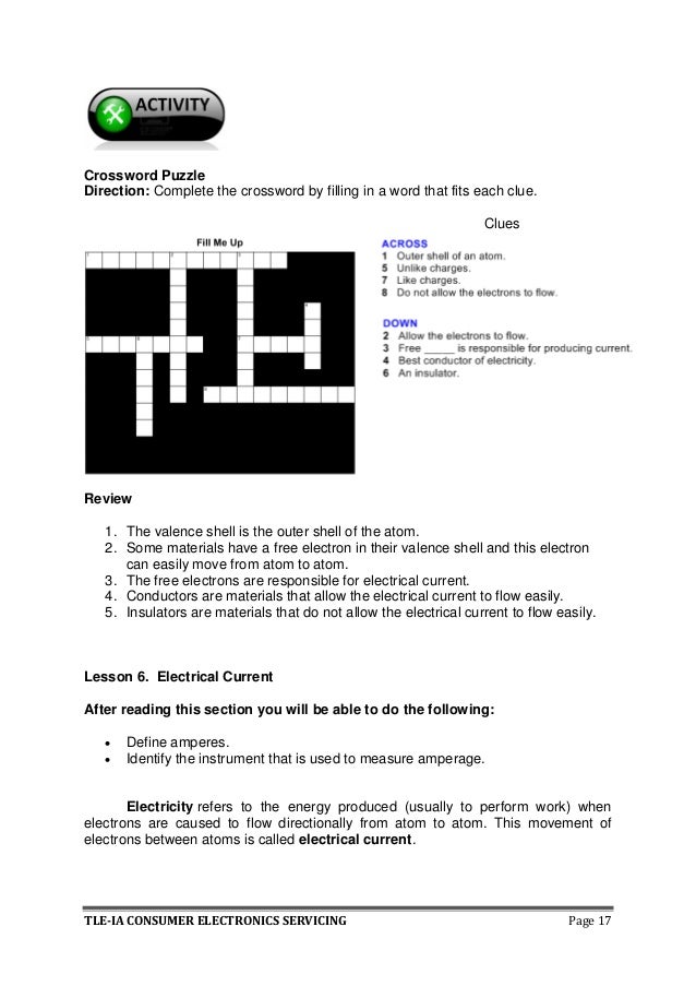 Stuck on a crossword puzzle answer. TLE-IA CONSUMER ELECTRONICS SERVICING Page 17 Crossword Puzzle Direction. Grade 8 Unit 1.